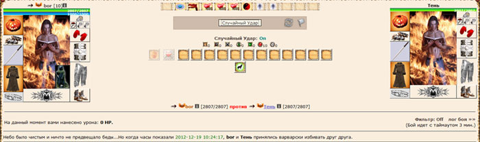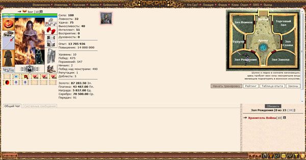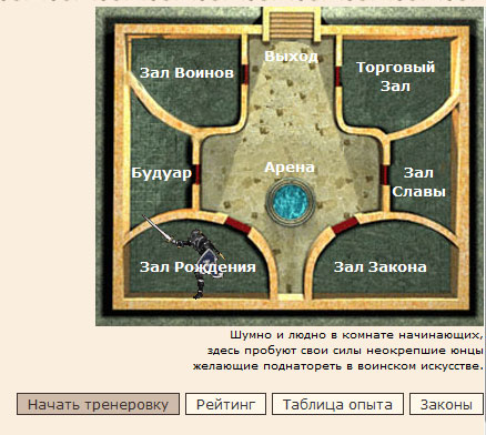 Итак, игровая страница состоит из трех фреймов. В верхнем фрейме вы можете увидеть своего персонажа (слева) и комната Арена (справа). Но обо всём по порядку.