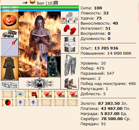 Ваш уровень. Количество побед, поражений и сумма игровых денег которой вы располагаете в данный момент. Изначально количество денег равно 100 Зл.
