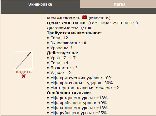 Чтобы сражаться оружием, необходимо взять его в руки. Кликните мышкой на слово "[надеть]", расположенное рядом с предметом: